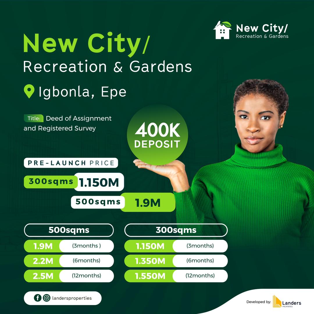 NEW CITY-Recreation & Gardens (Africa’s Largest Gardens and Wellness Hub) Igbonla, Epe. It is an eco-friendly, all green community poised to give you the total package of HEALTH and WEALTH. Whether you are buying your 1st or 10th property NEW CITY-Recreation & Gardens is 1st of its kind. FEATURES - Perimeter Fence - Paved roads - Drainage/sewage system - Solar powered street lights - Gatehous
